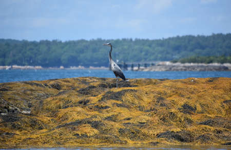 Great blue heron bird standing on a blanket of seaweed in Casco Bay.