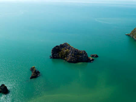 Lonely little islands in ocean, sea. Image on drone. Park Kilim Geoforest. Langkawi, Malaysia.