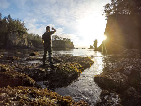 Explorer watching the bright sunset in Cape Flattery, on the Washington Coast