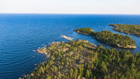 Beauty of rocky islands surrounded by the vast blue sea, interspersed with lush green forests under clear skies.