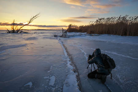 Photographer take pictures on the ice near the shore during sunset