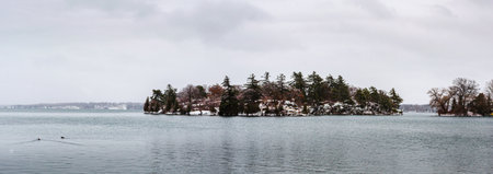 Panorama of two winter Islands on a snowy day in the Thousand (1000) Islands, St. Lawrence River region with two ducks swimming