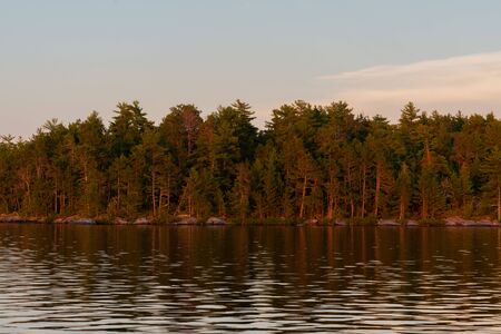 Pine trees on a rocky point on a summer day with blue sky and clouds at Croker Island in Ontario, Canada in the North Channel