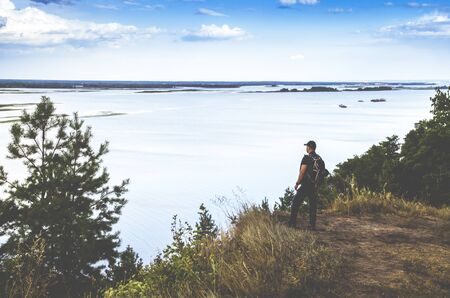 Man with a backpack stands on the edge of a cliff over a river amid a blue sky