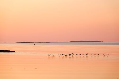 Flamingo Visitor Center, Everglades National Park, Florida, USA - July 14, 2018: Sunset in Everglades National Park in Florida with little birds in the beach