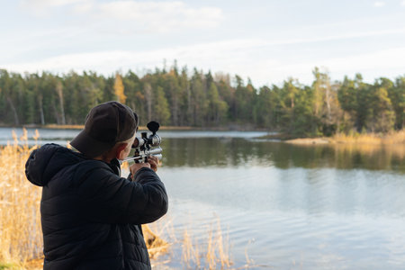 A man in a black jacket with a gun in his hands aims at the background of the lake.