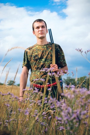 Hunter with shotgun gun on hunt. Portrait of hamdsome Hunter.