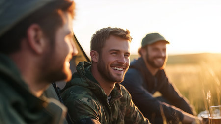 Rest for real men concept. Hunters with rifles relaxing in nature environment. Hunters friends enjoy leisure. Hunting with friends hobby leisure. Hunters satisfied with catch drink warming beverage