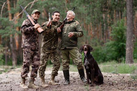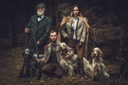 Group of multi-age hunters with dogs and shotguns in a traditional shooting clothing on a dark forest background.
