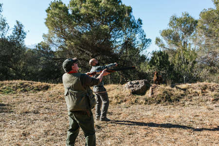 Two hunters moving with shotgun, looking for prey. Hunting for hare