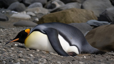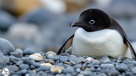 This close-up photograph captures an adorable penguin resting among smooth pebbles, showcasing the beauty of wildlife in Antarctica. The image highlights the penguin's unique features and natural habitat.