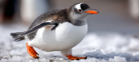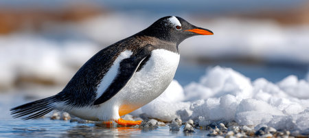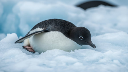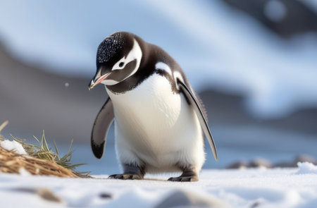 A charming penguin stands on a snowy expanse with a soft-focused icy blue background, evoking the serene and pristine environment of the polar regions