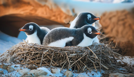 A serene scene featuring three gentoo penguins resting in their natural habitat. Surrounded by lush greenery, these charming birds symbolize wildlife's beauty and tranquility.