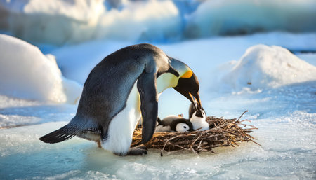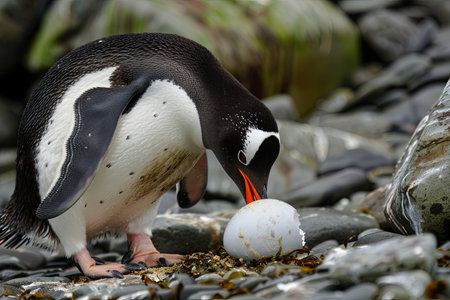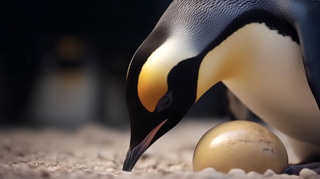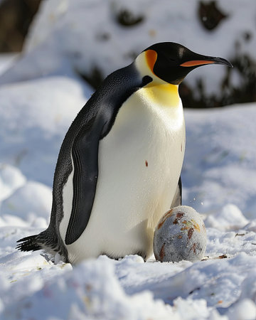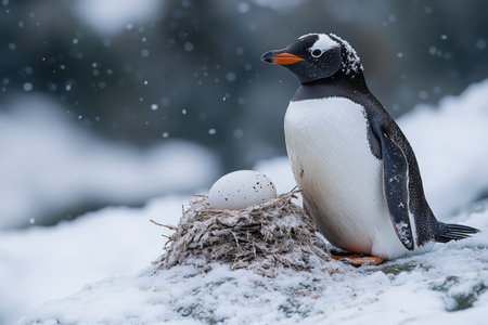 Penguin nesting with egg in snowy environment, showcasing protective behavior in cold Antarctic habitat.