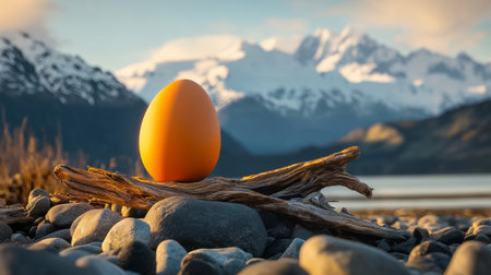 Orange egg balanced on driftwood among pebbles with snowcapped mountains in the background at golden hour. Tranquil nature and creativity concept