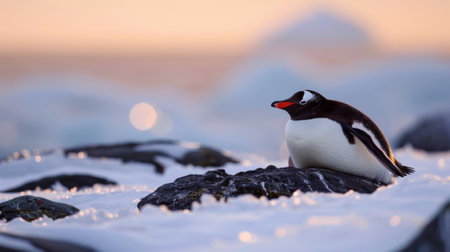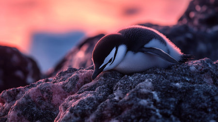 Chinstrap penguin resting on rocky terrain at sunset, with vibrant pink and purple sky. Wildlife and serene nature photography concept