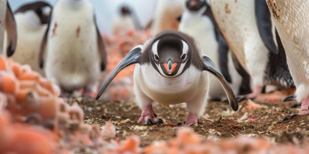 A curious penguin chick looks towards the camera surrounded by a bustling penguin colony