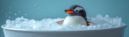 A penguin relaxes in a white bathtub filled with ice cubes, set against a light blue background