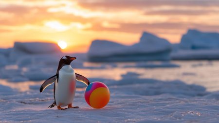 A charming image of a penguin standing next to a colorful beach ball on a snowy landscape, with a beautiful sunset in the background.