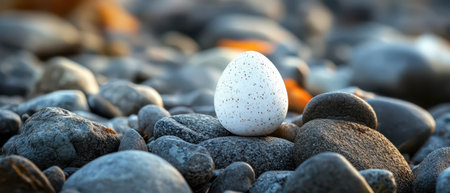A solitary white speckled egg is positioned on a bed of smooth, rounded stones, surrounded by elements of nature, creating a tranquil and serene atmosphere.