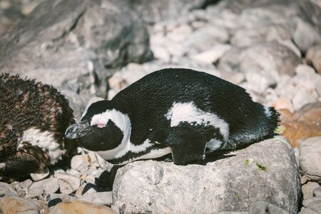 Humboldt penguins standing in natural environment, on the rocks near the water