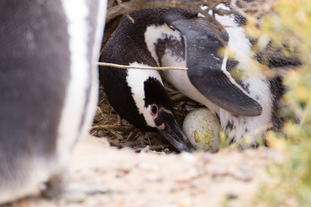 Magellanic penguin incubating egg. Punta Tombo penguin colony, Patagonia, Argentina