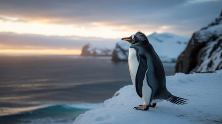 Penguin looks out over ocean from snowy cliff as the sun sets behind distant hills in a cold landscape.
