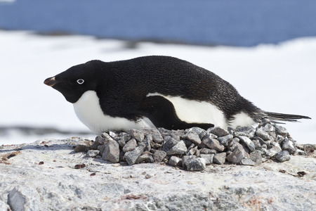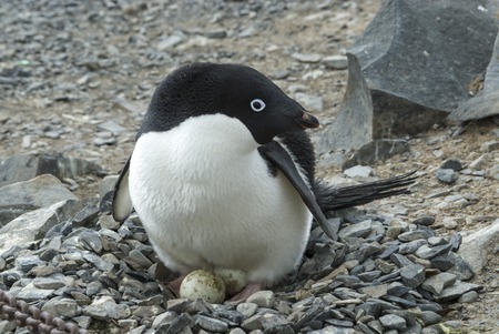 Portrait of Adelie penguin sitting in the nest, and looking up