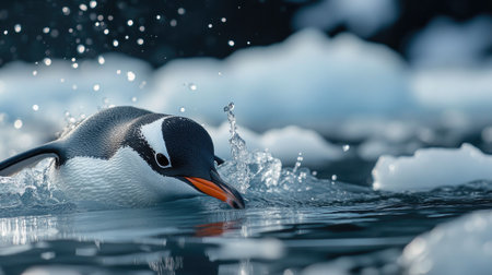 A penguin surfacing from a dive, its head breaking through the icy water amidst floating ice, with a snowy landscape in the background