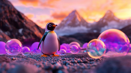 Sweet penguin character surrounded by rainbow bubbles, ethereal scenery in the distance