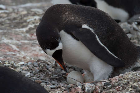 Close-up of a Rockhopper female hatching an egg in her nest on Saunders Island, Falkland Islands