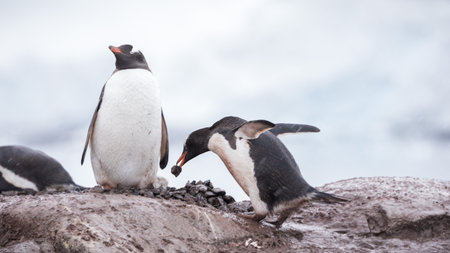 Penguin chick offers a pebble to another penguin, showcasing a tender moment of courtship or bonding in their natural habitat
