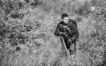 Man hunting wait for animal. Hunter with rifle ready to hunting nature background. Hunting skills and strategy. Hunting strategy or method for locating targeting and killing targeted animal