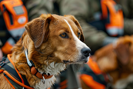 Dog Participates in Training Exercise in a Forested Area, Showcasing Teamwork and Focus Among Trainers During Autumn Season With Vibrant Foliage. Generative AI
