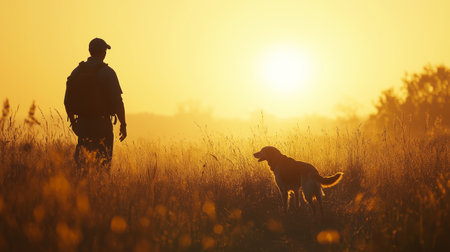 A man and his dog enjoy a peaceful stroll through a golden field at sunset, creating a serene moment in natures beauty