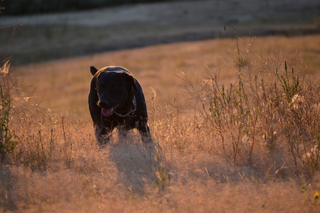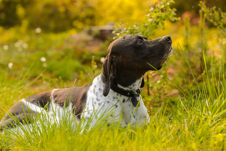Dog english pointer relaxing in the grass and enjoying warm summer sunset
