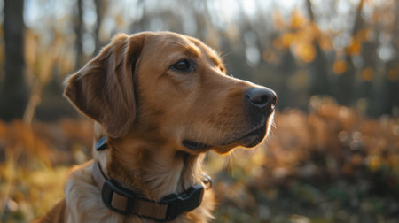 A golden retriever sits gracefully in an autumn forest, showcasing its warm fur and thoughtful gaze. Natural light enhances the serene atmosphere of this outdoor scene.