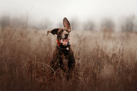 happy shorthaired pointer dog running outdoors in a tracking collar