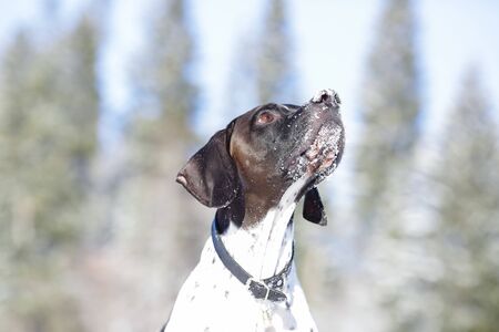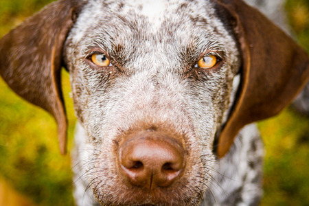 Old dog on street. Close up of dog. Old German Pointer pet dog animal. Cute dog portrait. Beautiful dog. City dog life. German Shorthaired Pointer.