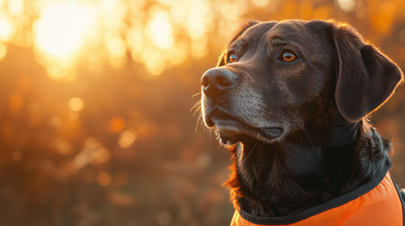 A chocolate labrador wearing an orange vest looks up seriously in a serene outdoor setting with warm golden light.