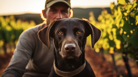 Dog trainer at vineyard trains working dog lush grapevines and ripe grapes