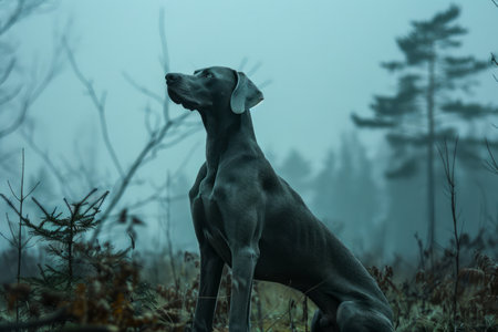 Majestic Grey Weimaraner Dog Standing Alert in Misty Forest Scene AI Generative