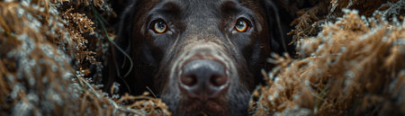 A captivating portrayal of a dog's innocent gaze peeking through vibrant foliage The emerald leaves and wildflowers frame the dog's expressive eyes, capturing the essence of wilderness and purity The close-up perspective invites viewers to connect with the dog's playful spirit and explore the beauty of the surrounding nature AI Generative