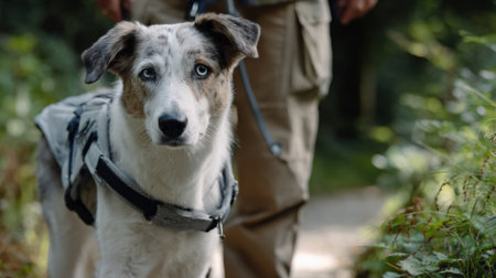 A dog wearing a vest is standing next to a person. The dog is looking at the camera with a serious expression