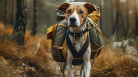 Dog with human-like qualities, carrying a backpack, treks through a sunlit forest