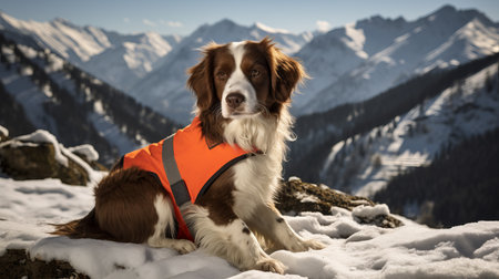 Adorable rescue dog in bright signal vest on snow in mountains, close up with copy space