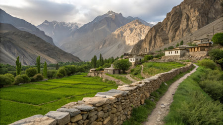 Explore a stunning mountain valley featuring lush green fields and dramatic peaks under a beautiful cloudy sky, perfect for nature lovers and adventurers.
