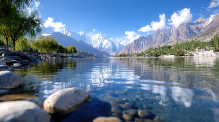 This stunning image captures a tranquil lake reflecting majestic snow-capped mountains, framed by vibrant greenery and a bright blue sky, perfect for nature lovers.