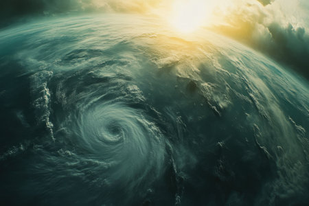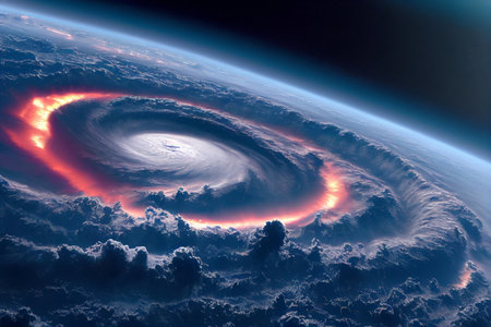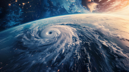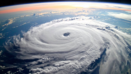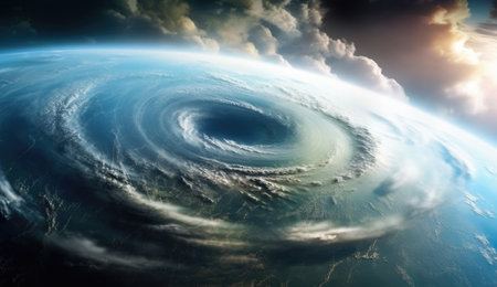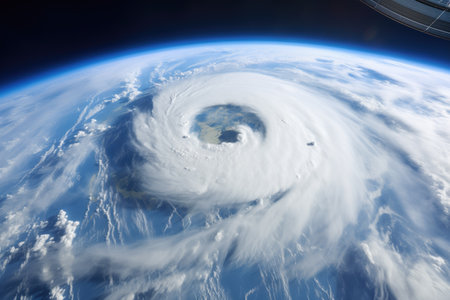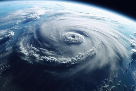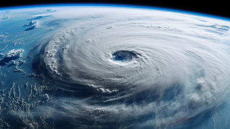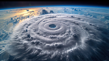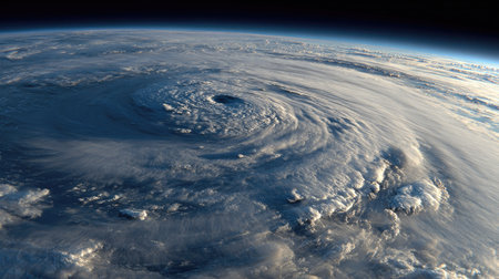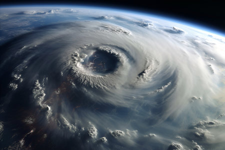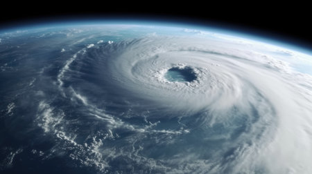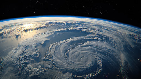 Earth's curved horizon showing a massive hurricane, its swirling clouds forming an eye, seen from orbit, illustrating global weather patterns and the immense power of nature
