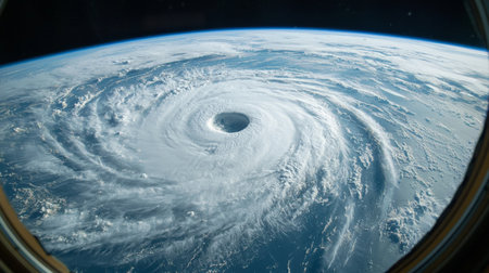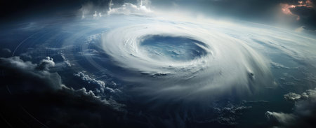 Aerial view of hurricane eye surrounded by swirling clouds, dramatic weather phenomenon